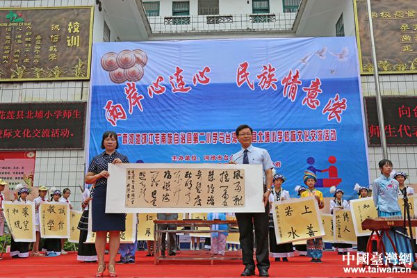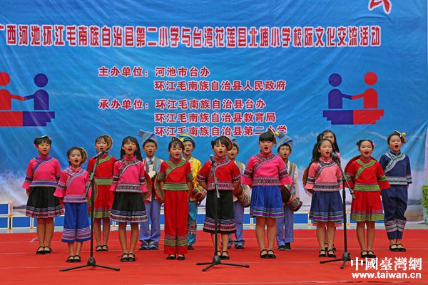 中国台湾网7月12日河池讯 6月29日,广西环江毛南族自治县第二小学与台湾花莲县北埔小学开展“两岸心连心 民族情意浓”校际民族文化交流活动。