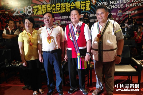 河池市委副书记唐标文(左二)与花莲县长傅崐萁在丰年节表演上(右二)合影。(图片来源:河池市台办)
