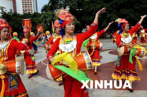南宁市绿城之声民俗庆典艺术团的老年演员在表演壮族师公“岳”鼓舞。(2008年7月27日新华社记者 周华 摄)。