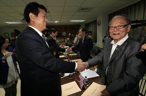 2月24日,在台湾高雄,广西代表(左)与台方代表在签约后握手。当日,桂台渔业合作项目签约仪式在高雄举行,签约合作项目6个,内容涵盖冷链物流基地项目、观光农业科研中心项目、优质肉牛品种研发项目合作意向书等,总投资额20多亿元人民币。新华社发