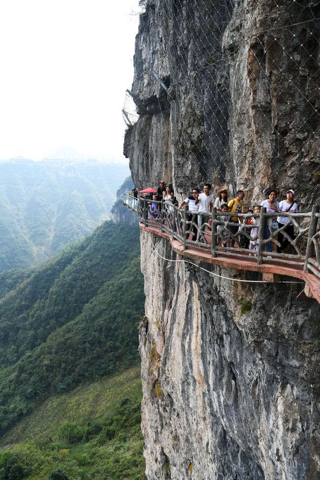 2019年10月5日,游客行走在朱砂古镇景区栈道上。 新华社记者 杨文斌 摄