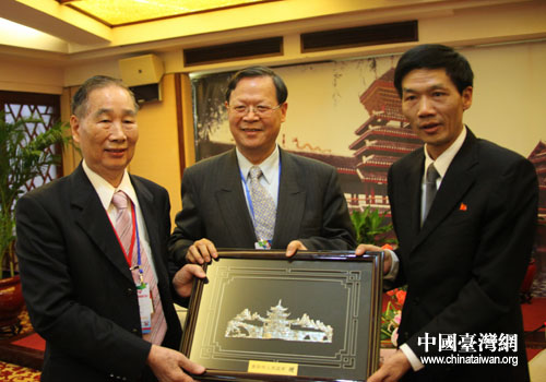贵州省贵阳市市长李再勇(右一)向台湾嘉宾赠送带有贵阳民族特色的纪念品(贵阳市台办 胡珊珊 摄)
