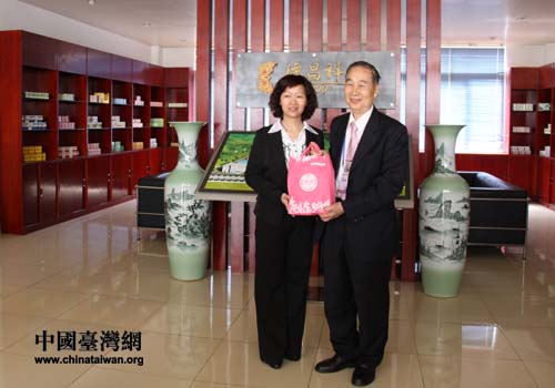 台湾嘉宾走进贵阳扎佐镇医药园区参观考察,企业负责人正与台湾中药公会理事长、交流参访团嘉宾林所先生交换礼品(贵阳市台办 李庆斌 摄)
