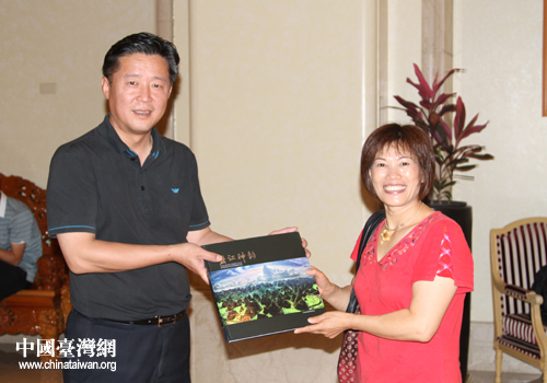 中国台湾网6月13日消息 日前,黔西南州赴台考察团看望了黔西南州籍出嫁到台湾的同乡何丽女士,与其亲切交谈,询问其在台湾生活工作情况并带去了家乡“盘江神韵”画册和布依族手工制绣三件套。
