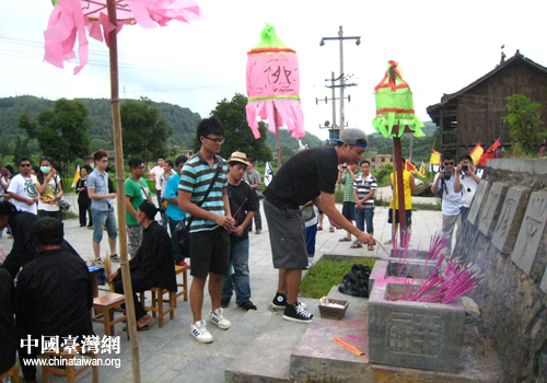台湾大学生在给水族祖先敬香。(黔南州台办 桂勇 摄)