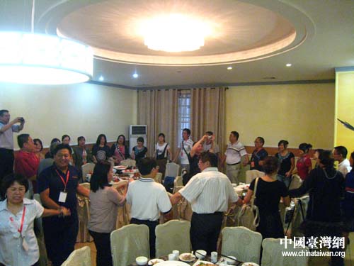 宴请联欢会上,杨承志发表了热情洋溢的祝酒词,欢迎台湾同胞的到来,让大家共同度过美好难忘的“六月六”。台湾少数民族教师参访团卢晓玲女士激动地说,我们展示台湾少数民族的歌与舞,让大家共同分享节日的快乐。大家在热烈的气氛中,相互敬酒,叙民族情,歌唱布依族“好花红”民歌,台湾“我们都是一家人”,“手牵着手,肩并着肩……”,欢快地跳起了舞蹈,把联欢会推向高潮。