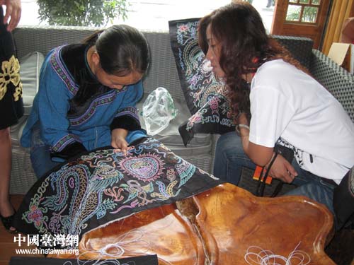 参观非物质文化遗产马尾绣。水族的刺绣工艺有绣、挑、补、编等手法、多用于穿戴装饰,内容多为花、鸟、虫、兽、人物或几何图形案,色彩鲜明、形象深动、大胆夸张、想象丰富。其中,马尾绣工艺堪称一绝。(黔南州台办 桂勇 摄)