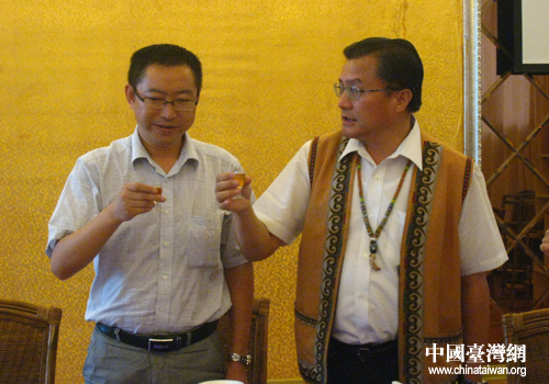三都县委副书记罗友军给台湾少数民族生存发展协会理事长孔文吉敬酒。(黔南州台办 桂勇 摄)