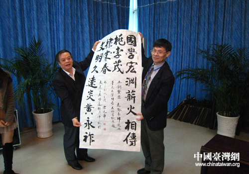梁光华现场吟诵了他为交流会所作的一幅对联:国学宏渊薪火相传桃李茂;文明久远炎黄永祚棣棠春。并将对联抒写成书法作品赠送给台东大学,表达了对两岸真情交流,共创繁荣的美好祝愿,赢得在场阵阵热烈的掌声。随后,台东大学向黔南师院赠送了台东大学校办资料,以表达深情厚谊。