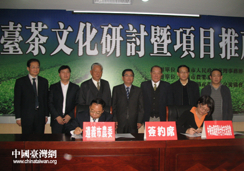 中国台湾网11月1日遵义消息 日前,在贵州遵义市湄潭县举行的“遵台茶文化研讨会暨项目推荐会”上,遵义市农业委员会主任罗绍怀与台湾中华知识产学合作交流协会秘书长严富美签订了农业战略合作框架协议。