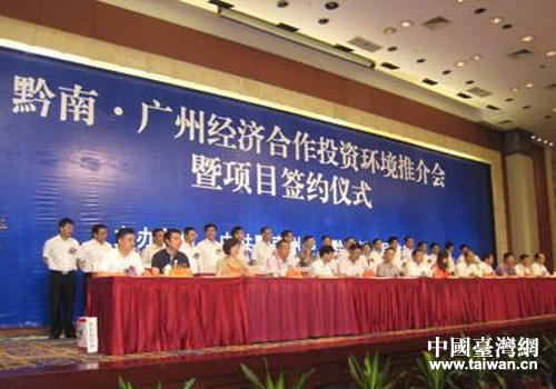 中国台湾网7月17日广州消息 日前,由贵州省黔南州委、州政府主办的黔南·广州经济投资环境推介会暨项目签约仪式在广州东方宾馆举行。广州市台办经济工作处副处长陈少华,广州台商协会常务副会长、台商林显章先生应邀出席,黔南州台办调研员罗世云参加会议。