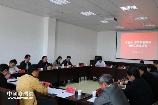 调研组一行分别召开座谈会,听取黔南州、黔东南州政府、州直有关部门和县区在地涉农台资企业发展、服务台商台企以及贯彻中央台办“31条措施”落地的情况汇报。结合两地的现有农业园区,本地农业发展规模、优势、特色,当地现代山地高效特色农业发展规划以及支持鼓励现代农业发展的政策措施等内容,与会人员共同探讨设立“黔台农业合作示范区”的可行性。黔南州副州长黎燕萍、黔东南州副州长吴坦参加座谈并建言推动“黔台农业合作示范区”落地本州。
