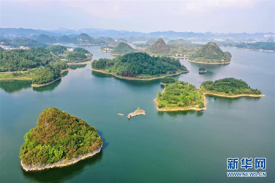 8月31日拍摄的百花湖风光(无人机照片)。秋日时节,贵阳市百花湖百余个岛屿峰峦起伏,呈现出一幅美丽画卷。新华社记者刘续摄