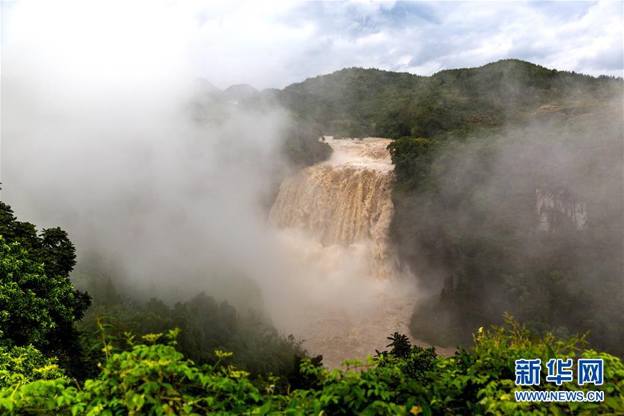 这是9月6日拍摄的黄果树瀑布。近日,受上游降雨影响,贵州黄果树瀑布流量增大,水流飞泻而下,蔚为壮观。新华社发(陈熙 摄)