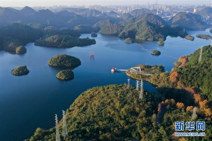 11月10日拍摄的贵阳市阿哈湖国家湿地公园(无人机照片)。初冬时节,贵州省贵阳市阿哈湖国家湿地公园色彩斑斓,景色怡人。新华社记者 欧东衢 摄