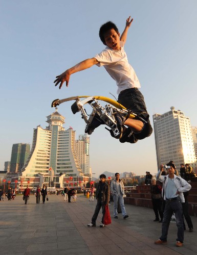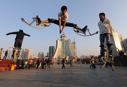 近日,一种健身“弹跳鞋”在贵阳亮相,受到年轻人青睐。据悉,“弹跳鞋”源于中国的高跷,由德国人研制开发,是一种集娱乐、健身、时尚为一体的休闲运动器材,北京奥运会闭幕式上“弹跳飞人”穿着“弹跳鞋”的表演至今令人难忘。 新华社发(吴东俊 摄)