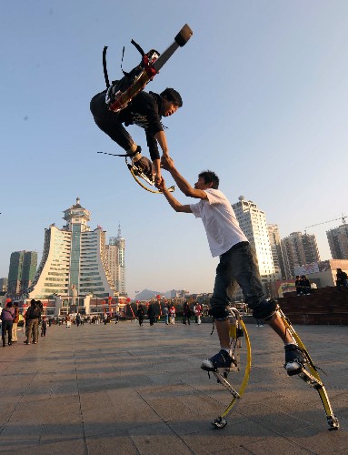 12月8日,两名年轻人在贵阳市人民广场穿着“弹跳鞋”进行健身运动。 新华社发(吴东俊 摄)