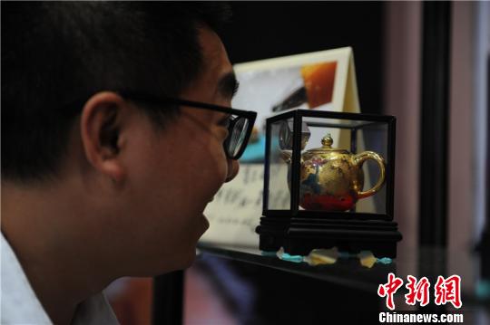 此次带来的26件作品包括陶瓷、镶金、翡翠材质做的微雕茶壶和酒壶造型等。比水滴还小的陶瓷酒壶、不足0.3厘米的黄金酒壶,0.2厘米大小的翡翠酒壶,除了这些放在针孔上还能“排排站”的小酒壶,还有头发上雕刻的熊猫、火材棒上写诗、南瓜子上的百寿图等。