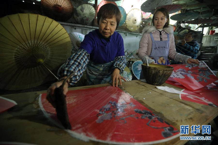 12月19日,在贵州省赤水市大同镇,赤水油纸伞制作技艺传承人李珍霞(左)在糊伞纸。