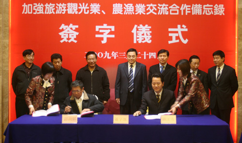 中国台湾网3月25日镇江消息 3月24日晚,江苏省镇江市农学会、镇江市旅游协会分别与应邀来访的台湾无党团结联盟主席、澎湖县两岸交流协会理事长林炳坤先生签订了加强农渔业、旅游观光业交流合作备忘录。这是澎湖县两岸交流协会与大陆民间在农渔业、旅游观光业方面的首次合作。