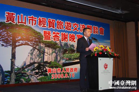 9月10日下午,黄山市在台北王朝大酒店成功举办经贸旅游招商推介会。台湾双电公会等30余家商业协会、台湾春保钨钢集团等90家企业,台湾东森电视台等10家当地媒体应邀到会。黄山市副市长徐健敏结合赴台参加“合肥——台北首航式”之机专程到场为推介会致辞,市长助理刘光、市旅委负责人作了招商、旅游推介,台湾中华国际观光协会理事长刘宗明、台湾春保钨钢集团董事长廖万隆代表台湾各界发言。中国国民党党主席吴伯雄、副主席蒋孝严、台湾“立委”刘盛良等知名人士为本次活动赠送了花篮。