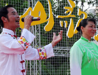 10月17日下午,闽西山歌手李银兰、许开聪在海峡两岸客家山歌赛上原汁原味的山歌表演深情并茂、获得该赛事第一名。当日,海峡两岸客家山歌赛在客家祖地福建上杭县举行,17位来自海峡两岸的山歌手参加了该比赛。两岸客家山歌手拉歌、情歌对唱,高潮迭起,吸引近千民众争睹。(记者 刘可耕 摄)
