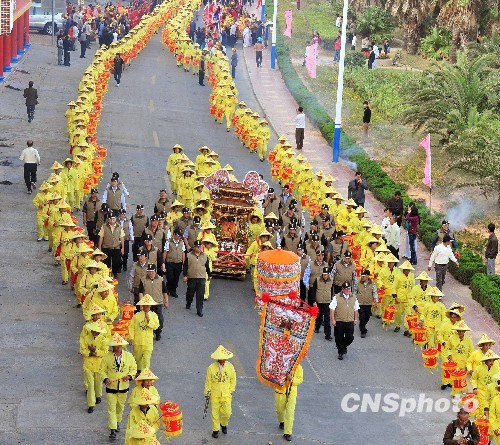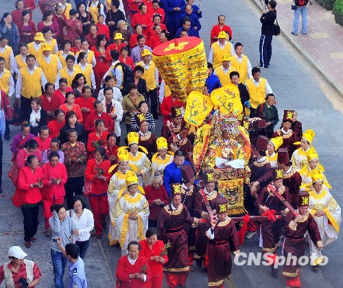 图为妈祖金身起驾巡安,钟鼓齐鸣、礼炮震天,场面极为壮观。中新社发 张丽君 摄