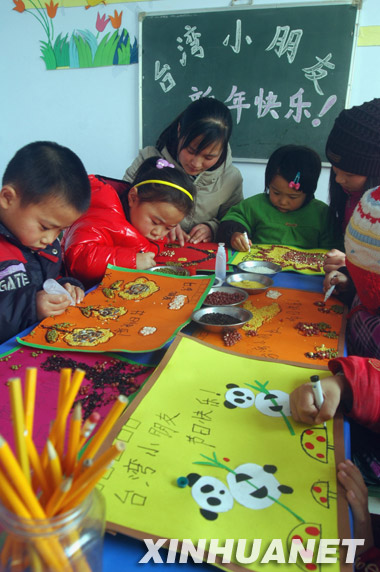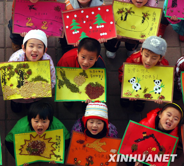 12月31日,山东省郯城县马头镇中心幼儿园小朋友展示制作的“五谷贺卡”。新年来临,郯城县马头镇中心幼儿园小朋友在老师指导下,用五谷制作“新年贺卡”,祝福台湾小朋友新年快乐。新华社发(房德华 摄)