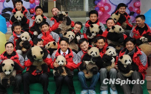 2月3日,16只大熊猫宝宝和工作人员一起合影。