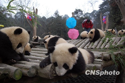 2月3日,卧龙中国保护大熊猫研究中心2009年繁育成活的16只大熊猫宝宝,搬进了大熊猫幼儿园的集体宿舍,离开妈妈开始独立生活。16只大熊猫宝宝均在5-8月龄之间,已基本具备了独立生活的能力。