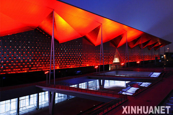 3月7日拍摄的进行灯光调试的上海世博会主题馆。上海世博会日益临近,世博园工地加快施工进度,已完工的场馆抓紧进行灯光调试。新华社发(郭长耀 摄)