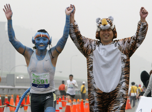 台北马拉松21日上午举行,整个高架路段满满都是选手,打扮成纳美人模样(左)与穿着老虎装(右)的选手一起跑步,吸引许多目光。图片来源:联合报