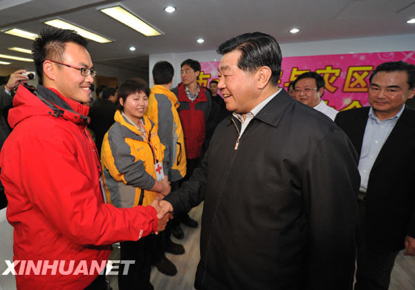 贾庆林与医疗救援队成员亲切握手。新华社 黄敬文 摄