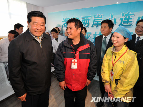 4月26日,中共中央政治局常委、全国政协主席贾庆林在青海省西宁市第一人民医院看望台湾医疗救援队成员,代表胡锦涛总书记、大陆同胞尤其是灾区群众,向台湾医疗救援队全体成员表示诚挚的感谢,并请他们向所有关心和支持抗震救灾的台湾同胞转达真诚的谢意。