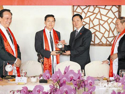 刘奇葆(右二)出席四川省感谢台湾社会各界援助“5·12”地震灾区见面会,向台湾救援队、医疗队、志愿者、援建单位代表和新闻单位的朋友赠送抗震救灾纪念章。图片来源:四川省台办