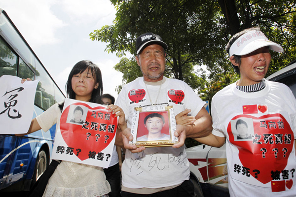 5月26日,深圳富士康厂外,富士康半年来“11跳”的首位遇难员工马向前的家属向媒体哭诉。