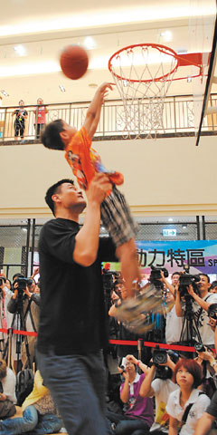 姚明抱起小男生灌篮,全场欢呼声不断。 来源:台湾《联合报》