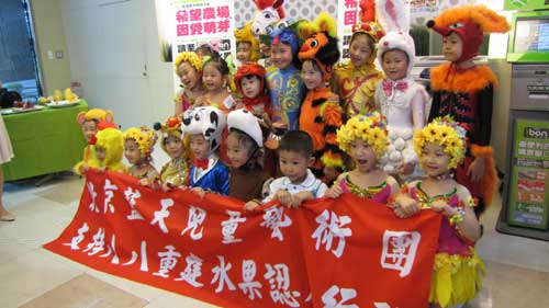 (记者吴亚明、徐蕾)在台湾“8·8”风灾周年之际,来自北京的蓝天儿童艺术团今天在这里举行了灾区果树认养活动。在台北统一超商大楼的“7—11”ibon便利生活站,孩子们穿着可爱的七彩戏服,边品尝台湾的各式水果,边用童言童语推广介绍,鼓励大朋友、小朋友一同加入爱心认养队伍,希望把爱传递到“8·8”灾区。