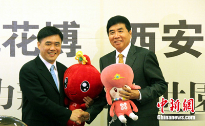 9月14日,台北市市长郝龙斌与西安市市长陈宝根在台北举办仪式,启动两市未来一整年的园艺接力与文化合作计划。台北市与西安市将在未来一年中次第举办花博会、世园会两项重要的世界园艺博览会,双方将开展多项具体合作规划。中新社记者 刘舒凌 摄
