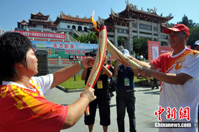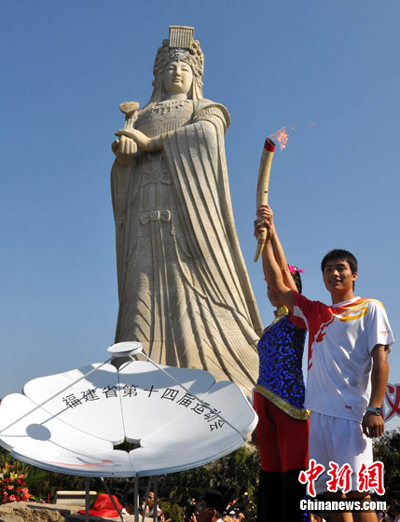 莆田籍运动员、首届青奥会激流回旋冠军王晓东和一名身着湄洲女服饰的圣女,共同点取象征“大爱之光、吉祥之火”的福建省第十四届运动会圣火。林剑冰 摄
