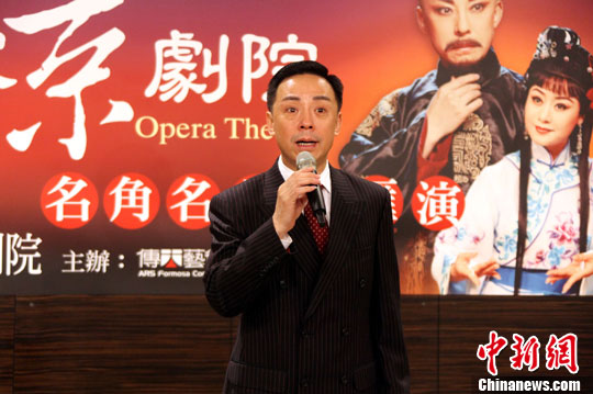 10月14日,著名京剧艺术家于魁智在台北亮相。图为于魁智在当天的记者会上即兴演唱传统剧目《上天台》选段。 中新社发 王健 摄