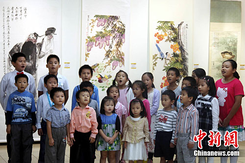 10月20日,由大陆中央文史研究馆书画院主办的“大道同行——两岸中国画艺术展”在台北“国父纪念馆”开幕。图为台北市大安区读经班的少年儿童在开幕式上背诵《论语》。中新社记者 陈立宇 摄