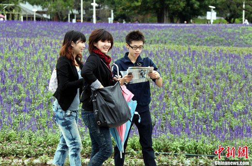首日赶来尝鲜的参观者,十分钟情园内多处大面积的“花海”造景。中新社发 王健 摄