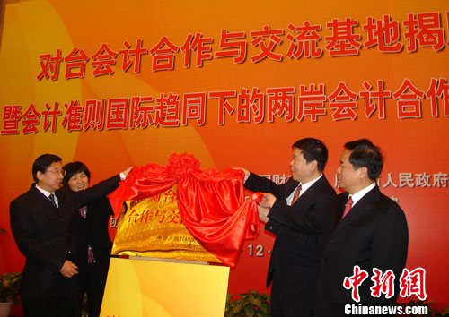 12月14日,国家对台会计合作与交流基地揭牌仪式暨“会计准则国际趋同下的两岸会计合作与交流”论坛在厦门举办。财政部副部长王军(右2)、中共厦门市委书记于伟国(左1)、厦门市长刘赐贵(右1)等共同为基地揭牌,这是大陆首个对台会计合作与交流基地,其建设总体目标是建设成为大陆对台会计工作的主要前沿和平台,和大陆对台会计合作与交流的重要桥梁和纽带。