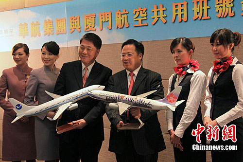12月27日,厦门航空与华信航空在台北签订航班代号共享协议,厦门航空与台湾华信航空将自2011年1月1日起以自由销售的形式,在厦门-台北和厦门-高雄航线上实施代号共享合作,以有效整合双方航班资源,双方在这两条航线上提供的航班数将增至每周14班和每周3班。中新社记者 关向东 摄