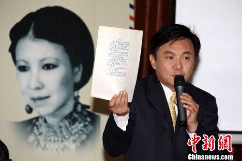 1月4日,台湾女作家三毛生前挚友眭澔平在北京举行新书《三毛的最后一封信》发布会。当天是三毛逝世20周年纪念日,眭澔平在现场回忆了诸多往事,还展示了三毛在离世前几天为他留下的信件、电话录音、生前遗物等。该书接续了三毛在文学、音乐和旅行上的梦想,用20年的时光、20个三毛的故事、20首纪念三毛的歌曲、20段三毛尘封的录音、20幅为三毛创作的画卷以及20年180多个国家的旅行记录,为天堂中的三毛寄出了一封回信。图为眭澔平展示三毛珍贵的手稿,是她写《滚滚红尘》的前言。