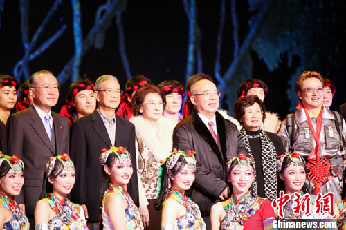 1月8日晚,中国国民党荣誉主席吴伯雄、台湾文化总会副会长林澄枝等在台北观看了大陆最顶尖的中国东方歌舞团演出《秘境之旅》后,与演员合影。吴伯雄并称赞演出“赏心悦目”。由大陆著名编导陈维亚率领的中国东方歌舞团百人阵容,于1月8日至9日在台北台大综合体育馆演出2场大型音乐舞蹈晚会《秘境之旅》,展现博大精深的西部歌舞文化。首场演出以融合现代舞的大胆创新、富节奏的音乐,以及诸多高科技手段,博得观众热烈反响。