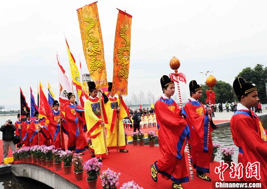 2月14日,以“弘扬临水文化、促进两岸交流”为主题的第四届陈靖姑(福州)文化节在福州市南江滨公园九龙壁隆重举行,吸引了来自两岸各地近千名来宾及信众同谒临水夫人陈靖姑。图为祭祀大典上的仪仗队。中新社记者 刘可耕 摄