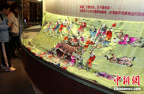 其中,北京宋庆龄故居馆藏的56件文物系首次在台展出。孙中山穿过的西服、用过的手杖、怀表、筷子、礼帽,签署遗嘱所用的钢笔,以及宋庆龄的名片、手绢、旗袍等都是难得一见的文物。而孙中山与宋庆龄的结婚礼物毛瑟手枪、宋母补送的嫁妆苏绣“吉庆有余”百子图被面等,弥足珍贵。