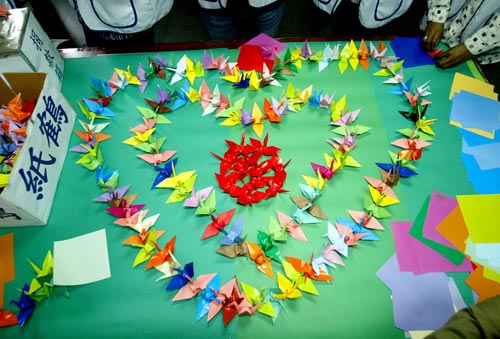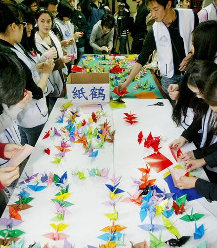 台湾师范大学教学中心15日举行“日本加油”折纸鹤募款活动,校内来自各个国家和地区的学生纷纷折纸鹤祈福,并吁全校师生踊跃捐款,协助日本度过难关。图片来源:台湾“中央社”